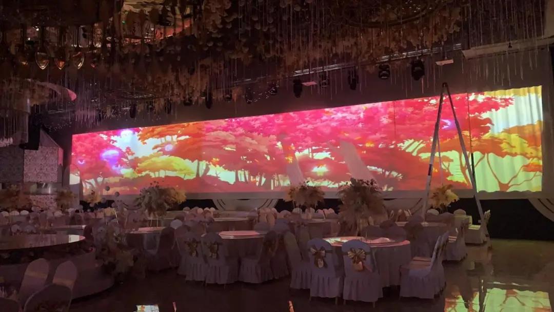 富貴滿堂酒店全息宴會廳,主要投影區域是宴會廳主持臺兩側的墻面,每側墻面長約20米,由于考慮到該宴會廳現有的安裝條件,為避免在投影畫面受到宴會廳現場吊頂裝飾物以及射燈的影響,采用的投影機必須光源壽命長,投影距離小、亮度要高、色彩要艷麗、投影尺寸要大等,經過綜合考量,最終選用了ROLY專業短焦系列激光投影機。