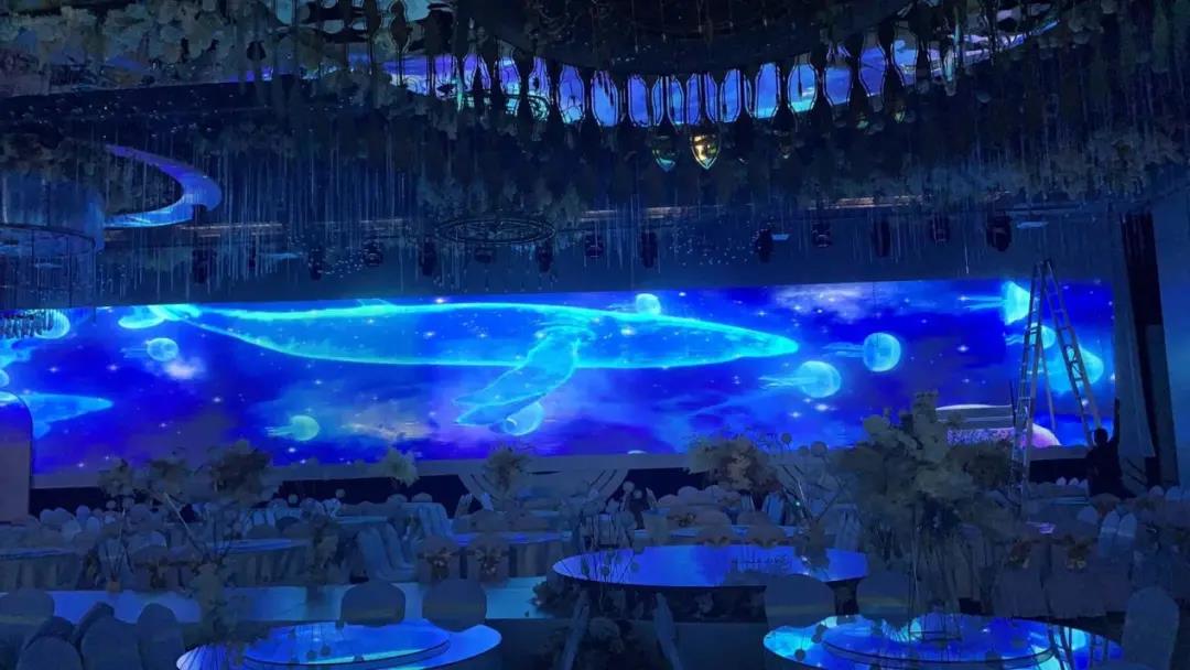 宴會廳選擇用投影機打造全息宴會廳主要在于投影機表達主題的豐富性和色彩表現的優越性,而且投影畫面的渲染技術所呈現出的畫面渾然一體,恢弘大氣。