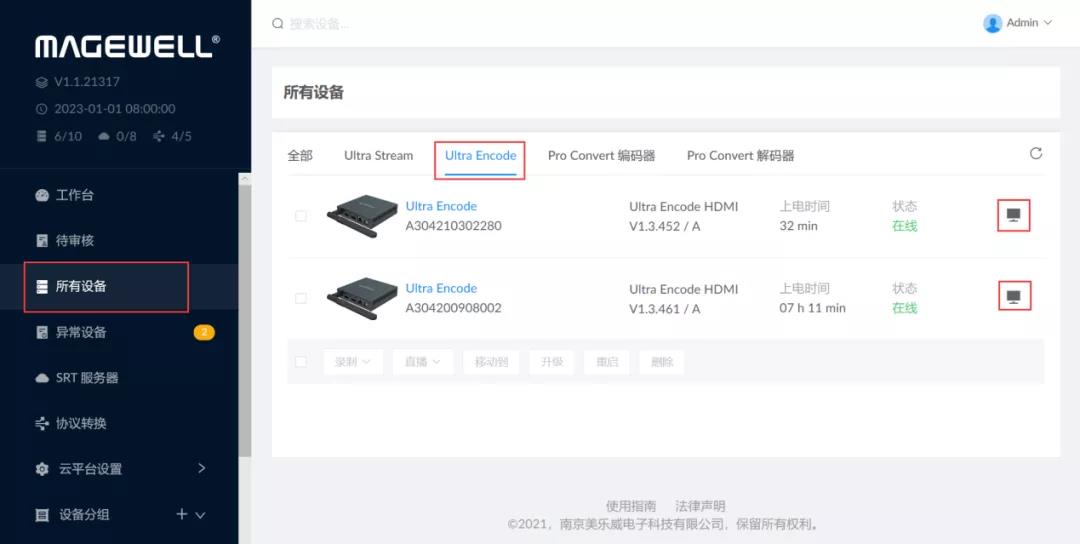 2. 進入“所有設備”頁簽,選擇“Ultra Encode”列表,點擊編碼盒右側電腦小圖標,進入編碼盒Web GUI。