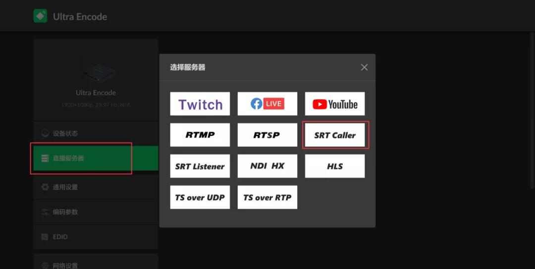 3.進入一臺編碼器“直播服務器”頁簽,選擇 “SRT Caller”
