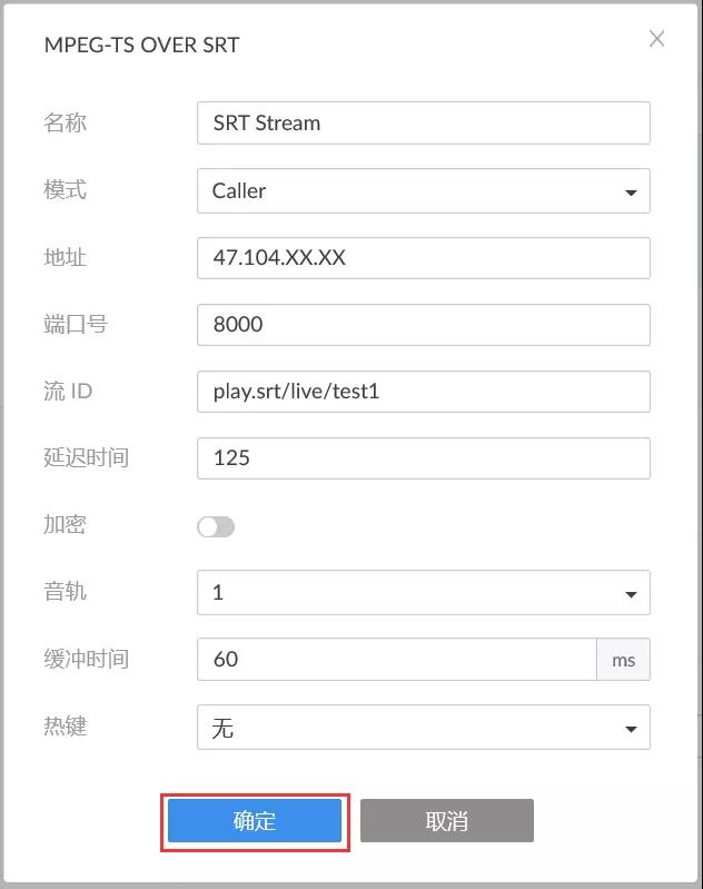 在彈出的頁面中填寫Magwell Cloud固定公網IP,端口號(如圖中的8000)和流ID(格式為“上傳域名稱/live/自定義名稱”,如圖中的upload.srt/live/test1,“test1”為自定義名稱),點擊“保存”。同理,登錄另一臺編碼盒Web GUI,重復上述步驟,流ID填寫為“upload.srt/live/test2”。