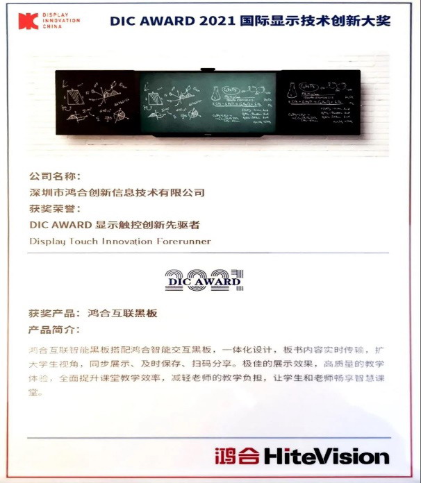 創(chuàng)新是鴻合科技發(fā)展的原動(dòng)力,以創(chuàng)新為矢志不渝追求的鴻合科技,在2021年帶來鴻合互聯(lián)智能黑板,一經(jīng)發(fā)布即榮獲中國光學(xué)光電子行業(yè)協(xié)會(huì)液晶分會(huì)(簡稱CODA)主辦的DIC AWARD國際顯示技術(shù)創(chuàng)新大獎(jiǎng)。鴻合互聯(lián)智能黑板采用先進(jìn)“黑板+屏+黑板”的一體化交互設(shè)計(jì),經(jīng)過層層選拔最終脫穎而出,這是權(quán)威機(jī)構(gòu)對于鴻合科技創(chuàng)新發(fā)展的肯定,這是對鴻合科技為中國顯示生態(tài)鏈創(chuàng)新升級所做貢獻(xiàn)的表彰。