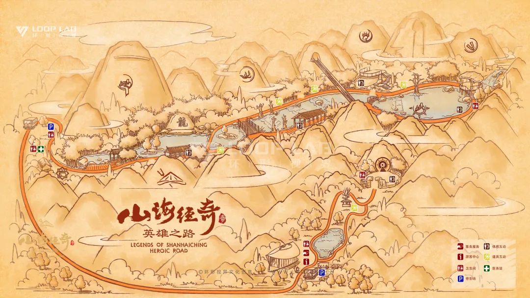 項目游覽路線約2.5公里,共分混沌世界、怒觸不周山、英雄現世、化熊抗水、緣起青丘、山川命名等6大篇章。同時,十余個星羅散布在山谷里的小劇情及互動章節將6大篇章串聯起來。