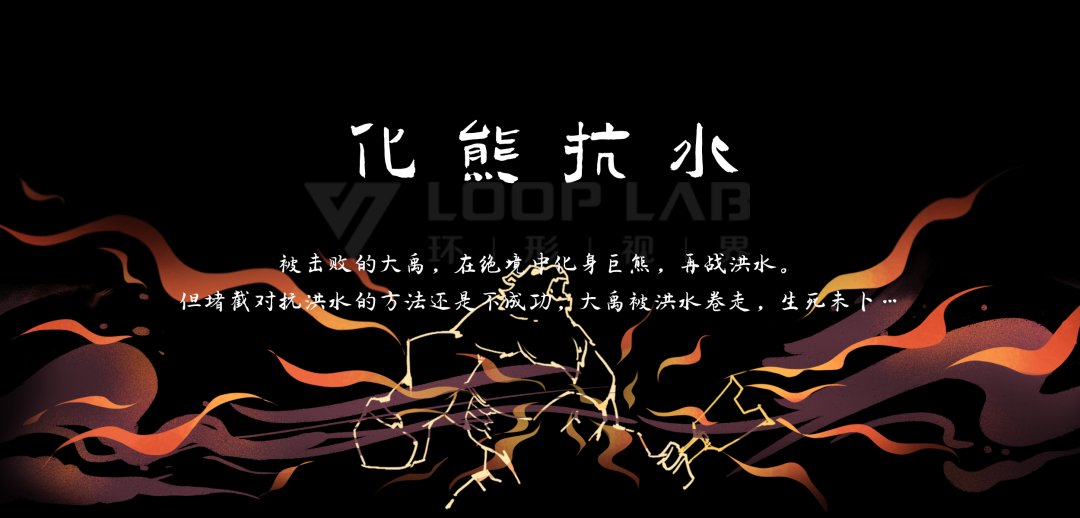 在應龍的幫助下,再一次面對洪水的大禹早已超然于常人,他頓悟了,明白了自然和諧之道,萬物皆有靈。他不再使用神力擊水,而是溝通化解沖突。洪水巨魔也受到了感化,放下戒備,與大禹達成了和解。大禹著下《禹貢》,賜江河山巒以姓名,自此水自東去,山川和美,萬物和諧…