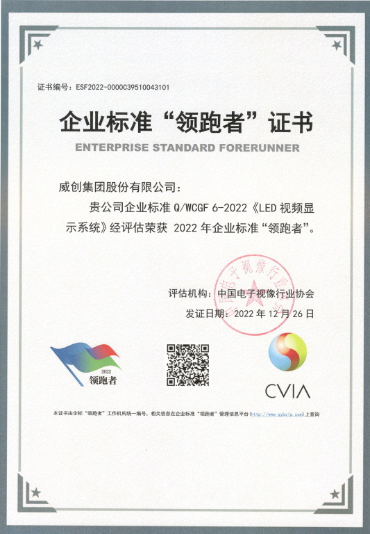 近日,威創(chuàng)企業(yè)標(biāo)準(zhǔn)Q/WCGF 6-2022《LED視頻顯示系統(tǒng)》經(jīng)評(píng)估榮獲2022年企業(yè)標(biāo)準(zhǔn)“領(lǐng)跑者”。