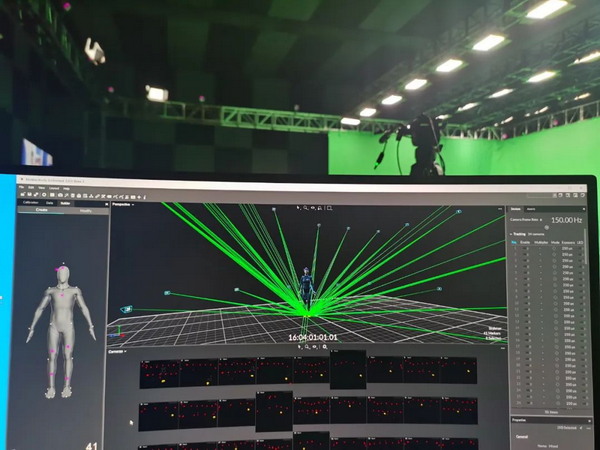 我們通過現(xiàn)場(chǎng)架設(shè)的34 臺(tái)Optitrack 動(dòng)捕攝像機(jī),運(yùn)用 Motive3.0 軟件對(duì)動(dòng)捕演員的身體動(dòng)作進(jìn)行識(shí)別、分析,形成骨骼數(shù)據(jù),并將骨骼數(shù)據(jù)流傳輸至 Motionbuilder,實(shí)時(shí)驅(qū)動(dòng)數(shù)字主持人“小漾”,為其注入活力,模擬完成主持人全部工作。同時(shí)配合節(jié)目組進(jìn)行與主持人間的對(duì)位,保障動(dòng)捕系統(tǒng)與 AR 實(shí)時(shí)渲染端系統(tǒng)的正常對(duì)接、現(xiàn)場(chǎng)多系統(tǒng)間的時(shí)碼同步,確保節(jié)目順利進(jìn)行。