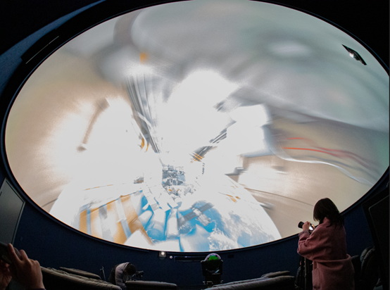 球幕直徑為8米,兩臺(tái)索尼VPL-GTZ380安裝于兩端,投影畫面拼接融合形成完整而細(xì)膩的穹頂。