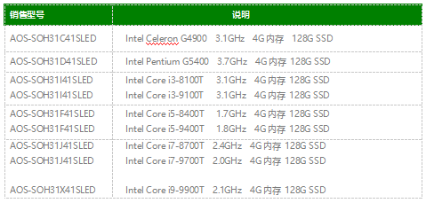 AOS-SOH31I41SLED符合LED一體機OPS插拔式電腦的方式,外殼采用陽極氧化處理,散熱器采用銅管散熱側吹,同時采用了標準的80PIN JAE接口,可能完美匹配LED一體機,從而簡化LED會議一體機的組裝。