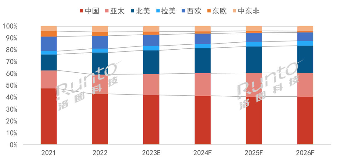 洛圖科技(RUNTO)數據公布,2022年北美的投影機出貨量占比達到了18.5%,位居海外市場第一位,亞太地區投影機2022年出貨量占比達到16.4%。此外,2022年卡塔爾世界杯帶動拉美和中東非地區的投影機出貨量份額提升,在全球市場中分別占到3.1%和5.0%。