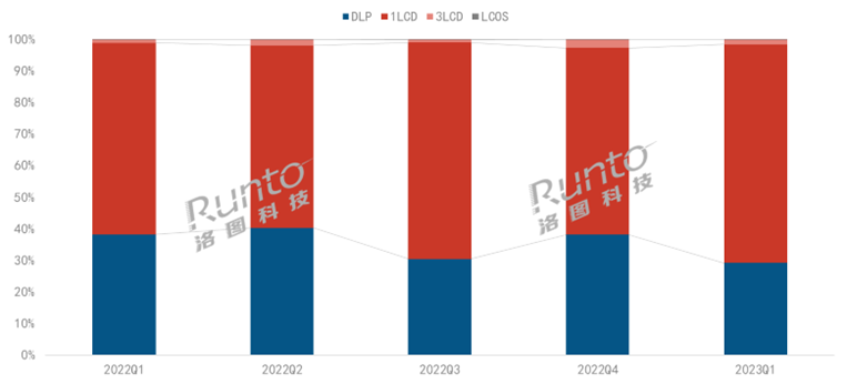 目前,從公布的數據來看, 相對其他消費電子產品,投影儀全球市場保持著明顯較快的增長速度,國內外的市場需求持續旺盛,而DLP市場持續萎縮,銷量大幅下降,1LCD技術的線上市場份額提升,原因在于近兩年遭受芯片短缺影響,曾經占據市場主流的DLP投影儀份額被LCD搶占。同時,LCD投影成為很多新興品牌進入市場的切入選擇,2023年的1LCD市場的競爭也將劇增。