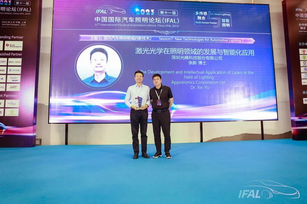 光峰科技副總裁余新受邀出席,做《激光光學在照明領域的發展與智能化應用》的主題分享,介紹光峰科技ALPD激光核心技術在照明領域的應用,以及對此前上海車展發布的全球首款車規級彩色激光大燈做進一步分享。