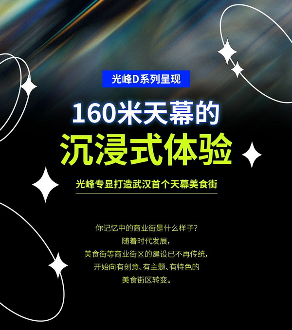 武漢沌口區的潮海美食街,是光峰工程在商業街應用上的又一生動案例,通過天幕給消費者夢幻的沉浸式體驗,讓普通的街道其變成科技、時尚的建筑體;