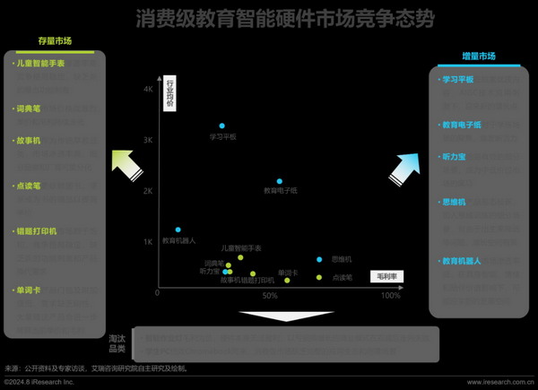當前校外的綜合功能產品以學習平板一類獨大。從應用趨勢來看,未來學習平板市場可能呈M型發展,高、低價位產品持續起量,中等價位產品市場收窄。對高價位產品而言,當前獨家優質內容已形成差異化競爭力,隨著AI技術的發展,未來用戶可能更看重個性化、陪伴性的交互體驗。這類產品以高線城市高收入家庭為主,家長對孩子教育投入高,青睞絕對的大品牌,對教育內容有高要求,對前沿科技應用有認知。對低價位產品而言,在新興電商的低價策略、頭部廠商的低價產品推廣中,低價產品勢頭強勁。這類產品以下沉市場用戶為主,他們有著一定教育投入預算和硬件購買理念,但對內容優質程度感知低,青睞護眼功能、產品配件等硬件創新。而中等價位產品由于內容、功能、價格均不具鮮明優勢,在消費降級的大環境下,市場份額逐步收窄。