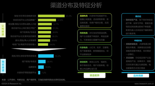 不同于校內完整、閉環的學習場景,校外的學習場景和痛點需求更加分散,除了綜合類的學習平板外,各類暢銷的垂直品類無外乎均找到了有效的細分場景,傳統品類中有專注于外出定位、溝通的兒童手表,專注于單詞和句子翻譯的詞典筆等,創新品類中有專注于聽力閱讀、口語練習的聽力寶、專注于護眼功能下刷題練習的學練機等。在具備了有效細分場景這一必要條件之后,尋找到適應時代發展、匹配品類特點的渠道則成為關鍵的下一步。在線上渠道未興起的時代,兒童手表更依賴線下商超和專賣店;隨著電商平臺、私域社群的發展,更低客單價、更易流轉的錯題打印機、詞典筆、電子單詞卡流行起來;短視頻時代,直播講解、公域引流更適合新品類的推廣,成為聽力寶、學練機等創新品類的關鍵銷售渠道。未來,教育智能硬件仍需要進一步深挖更多的細分場景,并結合適配產品特色和時代特征的渠道,以打造特定場景的爆款產品。