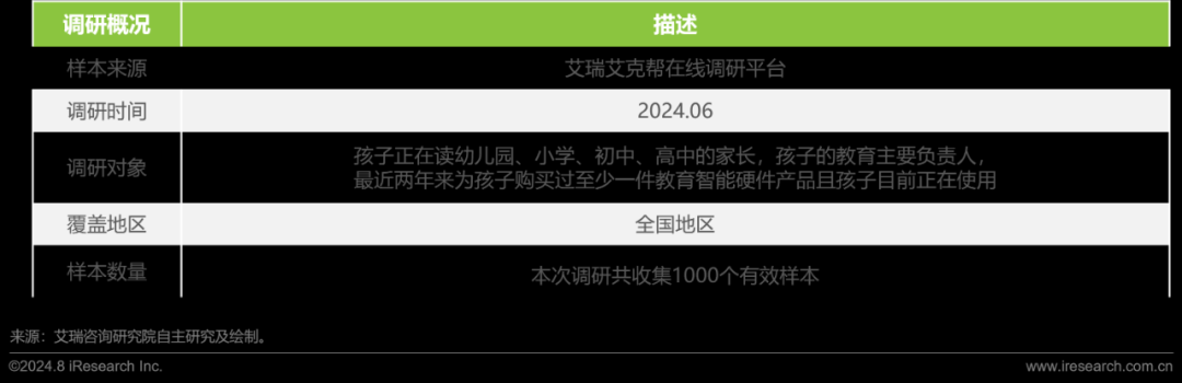 •本次調研采用問卷調查方法,通過艾瑞艾克幫在線調研社區收集樣本,針對近兩年內為孩子購買過教育智能硬件產品的家長進行調查。調研旨在從孩子家庭教育決策者和教育用品采購者的角度出發,深入了解各類型教育智能硬件在孩子學習中的定位、具體應用場景、家長評價、購買驅動力以及當前存在的痛點。