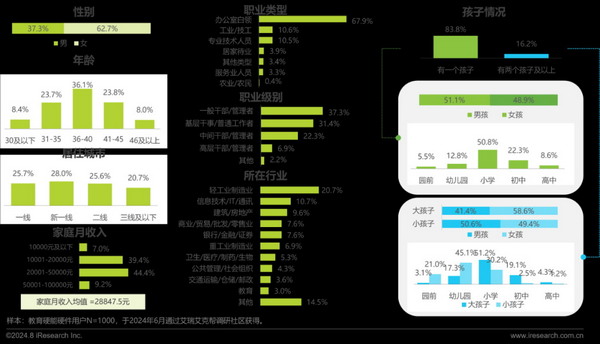 負責孩子教育且近兩年來購買過教育智能硬件的家長用戶以31-45歲的母親居多,多數生活在經濟較發達的一二線城市,家庭月收入多分布在1-5萬元;職業集中在辦公室白領,近七成任職管理類職務;孩子在各個學段均有覆蓋,其中小學生家長比例更大。