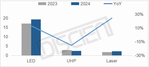 圖四:2024全球投影分技術類型出貨和同比走勢