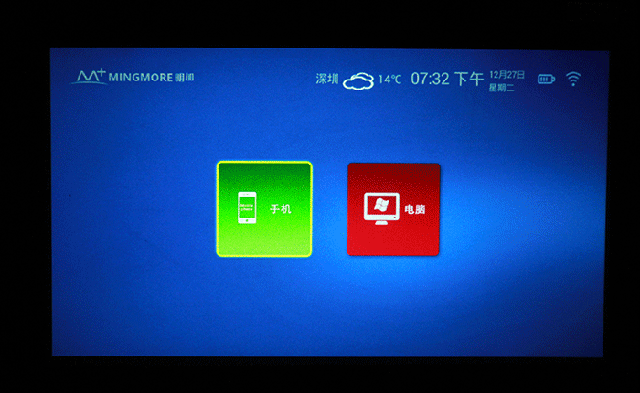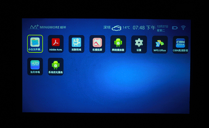 長按開機鍵5秒,啟動明加D3,就直接進入了投影主頁,可以看到四個大“方塊兒”和五個“小方塊兒”,由藍色、橙色、綠色、紅色組成的UI界面清新而明亮,顏值很高。明加D3最佳投影尺寸為20寸-80寸,這個時候再通過轉動調焦輪就可以投出清晰的大/小屏。