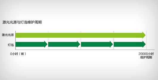 20,000小時光源免維護 *1*2 愛普生新研發的激光光源投影機使用了無機熒光輪和無機液晶面板,能夠帶來長達20,000 小時的免維護 *1*2。此外,激光光源來自多個激光二極管,所以即使一個二極管壞掉,圖像也不會受到影響。這免除了在重要演示中投影機光源可能會突然熄滅或變暗的風險。