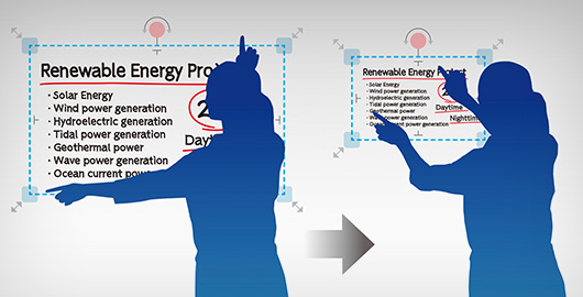手勢編輯 任意編輯和排列畫面上的所有內容,因此,即使屏幕上沒有書寫空間,可以將屏幕上的內容縮小為新的注釋騰出空間,也可以通過手勢對任意圖片和注釋進行縮放和旋轉。