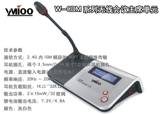 WIFI無(wú)線會(huì)議單元W-CDM7B/W-CDM7CYMIOO(優(yōu)麥)W-CDM7B數(shù)字無(wú)線WIFI主席單元和W-CDM7C數(shù)字無(wú)線WIFI代表單元是極具一款高檔的會(huì)議單元,單元和主機(jī)收發(fā)之間采用最新的2.4G的ISM頻段的WIFI無(wú)線網(wǎng)絡(luò)為傳輸調(diào)制技術(shù),IEEE802.11g的標(biāo)準(zhǔn),128位通信加密技術(shù),無(wú)需擔(dān)憂會(huì)議的泄露,單元采用耐用直流(12V/3A)可充電的內(nèi)置鋰電池工作,可持續(xù)工作8小時(shí),同時(shí)支持邊充電邊使用。[ 產(chǎn)品信息 ] 產(chǎn)品應(yīng)用場(chǎng)合: W-CDM系列無(wú)線YM-WIF100收發(fā)器YMIOO(優(yōu)麥)無(wú)線WIFI收發(fā)器專用于YMIOO無(wú)線WIFI會(huì)議主控機(jī)和無(wú)線WIFI會(huì)議單元之間的信號(hào)收發(fā)使用,一般確保通信穩(wěn)定可靠可裝置在會(huì)議室中,在以太網(wǎng)內(nèi)傳輸。[ 產(chǎn)品信息 ] 功能描述 1、 靈活、穩(wěn)定的WAP支持任意一款的觸摸屏作用于一個(gè)廣闊的覆蓋范圍和區(qū)域e W-CDM系列無(wú)線會(huì)議主機(jī)Ymioo(優(yōu)麥)運(yùn)用多年無(wú)線開(kāi)發(fā)研究的基礎(chǔ)上,基于2.4GISM頻段的WIFI無(wú)線網(wǎng)絡(luò)傳輸技術(shù)相結(jié)合的嵌入式數(shù)字處理高新技術(shù);對(duì)無(wú)線一次次又一次的推向現(xiàn)代高端會(huì)議的歷史舞臺(tái),該款無(wú)線會(huì)議主機(jī)采用全數(shù)字處理,采用雙向全雙工傳輸技術(shù),真正做到話筒與話筒之間,話筒與主機(jī)之間無(wú)縫隙的通信,內(nèi)置高功率發(fā)射器,只需配置數(shù)據(jù)控制流既可以實(shí)現(xiàn)整個(gè)會(huì)場(chǎng)的信息傳輸,而且每支話筒內(nèi)置高性能高存儲(chǔ)量的鋰電池,可以保證每支話筒可連續(xù)使用8~12小時(shí)的工作量,是國(guó)內(nèi)首家采用話筒與話筒之間、話筒與主機(jī)采用全雙工傳輸,傳輸信號(hào)根據(jù)準(zhǔn)確無(wú)誤的ID的基礎(chǔ)上傳輸,所以信息通過(guò)WIFI渠道傳輸保密又可靠,是當(dāng)之無(wú)愧的當(dāng)今高級(jí)無(wú)線會(huì)議的“佼佼者”。 [ 產(chǎn)品信息 ] W-CDM系列無(wú)線會(huì)議主席單元YMIOO(優(yōu)麥)W-CDM3B數(shù)字無(wú)線WIFI主席單元和W-CDM3C數(shù)字無(wú)線WIFI代表單元是極具一款高檔的會(huì)議單元,單元和主機(jī)收發(fā)之間采用最新的2.4G的ISM頻段的WIFI無(wú)線網(wǎng)絡(luò)為傳輸調(diào)制技術(shù),IEEE802.11g的標(biāo)準(zhǔn),128位通信加密技術(shù),無(wú)需擔(dān)憂會(huì)議的泄露,單元采用耐用直流(12V/3A)可充電的內(nèi)置鋰電池工作,可持續(xù)工作8小時(shí),同時(shí)支持邊充電邊使用。[ 產(chǎn)品信息 ] 產(chǎn)品應(yīng)用場(chǎng)合: W-CDM系列無(wú)線會(huì)議代表單元YMIOO(優(yōu)麥)W-CDM3B數(shù)字無(wú)線WIFI主席單元和W-CDM3C數(shù)字無(wú)線WIFI代表單元是極具一款高檔的會(huì)議單元,單元和主機(jī)收發(fā)之間采用最新的2.4G的ISM頻段的WIFI無(wú)線網(wǎng)絡(luò)為傳輸調(diào)制技術(shù),IEEE802.11g的標(biāo)準(zhǔn),128位通信加密技術(shù),無(wú)需擔(dān)憂會(huì)議的泄露,單元采用耐用直流(12V/3A)可充電的內(nèi)置鋰電池工作,可持續(xù)工作8小時(shí),同時(shí)支持邊充電邊使用。[ 產(chǎn)品信息 ] 產(chǎn)品應(yīng)用場(chǎng)合: 簡(jiǎn)約型無(wú)線會(huì)議-CM6180/CM6180T本機(jī)裝置容易,功能強(qiáng)大,特性穩(wěn)定,能在復(fù)雜的高級(jí)會(huì)議環(huán)境下,獲得最滿意的效果。[ 產(chǎn)品信息 ] 功 能 特 點(diǎn) |