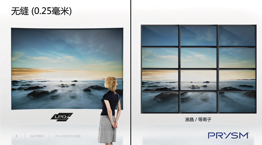 Prysm®公司創立于2005年,總部位于美國加州圣何塞(硅谷),在圣何塞(硅谷)、波士頓、印度班加羅爾設有工程研發中心 。在美國、日本和中國設有制造中心 。目前在圣何塞、洛杉磯、紐約、倫敦、迪拜、北京設有展示體驗中心。 持有Laser Phosphor Display(LPD)激光熒光體顯示技術專利。
