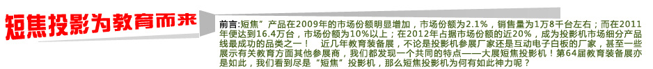 今后,愛(ài)普生在教育領(lǐng)域主要以短焦和超短焦為主,短焦與超短焦的區(qū)別不僅在價(jià)格方面,在技術(shù)方面也有區(qū)別,短焦一般是正投,采用魚眼鏡頭;而超短焦一般是反射式投影,投影距離更近,因此技術(shù)要求更高。