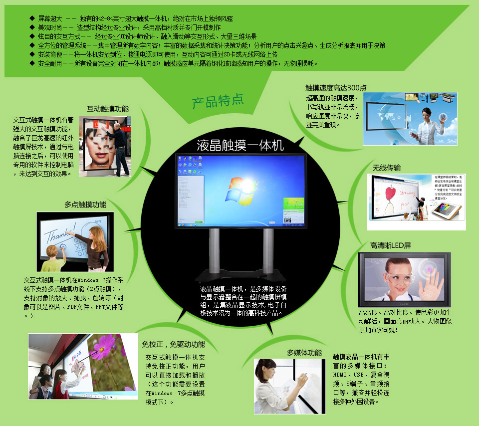 交互觸摸一體機產品的上市打破了電子白板市場競爭格局。縱觀2013年上半年,在諸多一線城市,備受歡迎。但是,隨著平板觸摸一體機產品出現,用戶選擇也更加豐富了,這給傳統電子白板廠家提出挑戰,因此,很多傳統白板廠家開始涉足一體機,在近幾年成為各大廠家競相開發的新型產品。