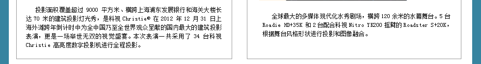 | 在我們整理的贏康攜手科視打造的這些經(jīng)典案例中,Roadie HD+35K投影機在這些案例中使用非常頻繁,此外也大量應用了其他型號投影機。這些高清、高亮的投影機在大型展館、歌劇院、大型演藝活動、主題公園、監(jiān)控室等都被大量的應用,在為用戶提供完善的解決方案的同事也為受眾提供震撼的視覺盛宴。 |