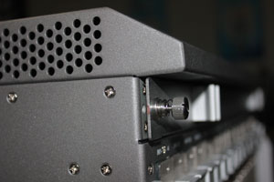 兩臺教育裝備一字排開,測試員李小姐插上傳輸線正在測試第一代高清混合矩陣切換產品功能。邢經理介紹說,我們看到的是公司研發的第一代高清混合矩陣產品,這款產品無論是從外觀還質量深得用戶青睞,以至于現在還有很多老客戶采購。