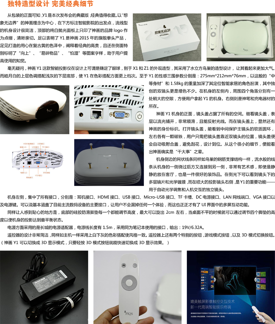 面對投影行業的這一主流趨勢,神畫研發產品的腳步從未停止。繼震驚行業的神畫X1系列智能投影儀之后的今年4月底發布會,再次迎來了神畫兩款投影新品的誕生——Y1和Z1。當中的Y1搭載了國內智能投影中首顆亮度高達500流明的光源,并加入了實時的光學校正和虛擬觸控功能,希望提供媲美傳統投影的效果之外,將投影儀自動/智能化。但它的實際表現又會如何?這次拿到的產品是發布會典藏版,機器采用非常結實的全白硬紙盒包裝,包裝內部有厚實的緩沖材料固定機身和遙控。而本次小編給大家帶來的試用評測便是其中最耐人尋味的雙鏡頭Y1。 作為一款智能投影儀——Y1,其不同于X1和Z1的產品定位,以“中等身材”打造出了更加符合現代家居風格韻味的皓月白鳥巢造型。而這一外觀的設計,也是緣于偏向智能家居的定位需求,兩側的鏤空框架增強了工作狀態的散熱,正好符合了家居長時間使用的消耗情況。除此,自動對焦與虛擬觸控兩大獨創技術也是與生俱來,同時還賦予了首創的雙鏡頭投射模式,使投影的畫面質量更佳。