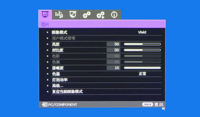 圖像模式有五種:Vivid、Cinema、Bright、Sport、Game,亮度和對比度、清晰度等等參數(shù)可以根據(jù)自己的要求進行調(diào)節(jié)