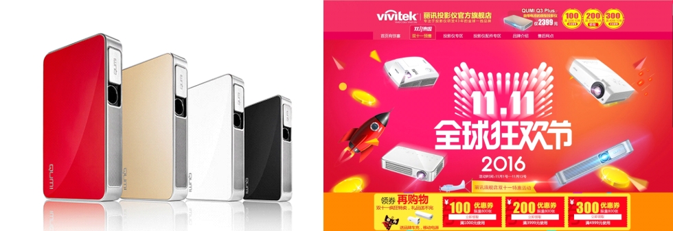 推薦理由:QUMI Q3 Plus具備500流明亮度,領先的LED光源壽命長達30000小時,徹底免除使用者更換燈泡的煩惱。在正常環境中可輕松打造100寸超大畫面,支持DLP-LINK主動式3D技術,并同時引入藍牙和MHL連接功能,可與智能手機、平板電腦、藍牙音箱等設備輕松連接。此外,QUMI Q3 Plus突破性搭配8000毫安的嵌入式大容量電池,支持單機投影時間長達2小時,有效解決戶外使用時間過短的缺憾。當然,QUMI系列一直所具備的USB直讀、WIFI投影等優秀功能也在QUMI Q3 Plus身上得到了延續,使得這款產品在外觀和性能上做到了“內外兼修”。鉅惠活動:在本次Vivitek(麗訊)天貓旗艦店“11.11”的五重驚喜中,限時秒殺活動無疑是最刺激和最吸引人的,秒殺活動涉及Vivitek(麗訊)微投QUMI Q3 Plus、商教機型D552、D555WH、DS234四款機型,活動時間為11月11日0:00—1:59:59,在兩個小時的時間內,QUMI Q3 Plus、D552、D555WH、DS234四款機型的秒殺價分別為1999元、1799元、2399元、1799元,相比于原價優惠都達到了數百元,數量有限,先“秒”先得,而且這樣的冰點價格足可以秒殺很多高端電視和同類投影機。 購買鏈接:https://vivitek.tmall.com/ |