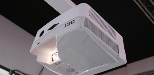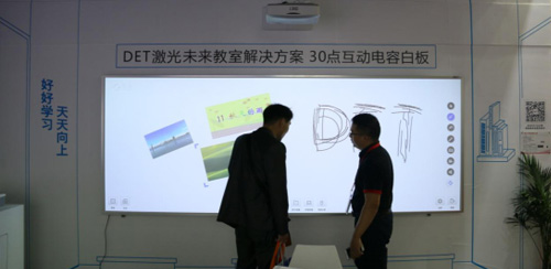 針對未來教室的解決方案,DET也在本次展會展示了激光互動未來課堂的嶄新體驗。它是由DET-T1與DET-Touch1搭建而成。DET-T1是專用于教學的超短焦、超寬屏激光教育投影機,亮度達3600流明,超短焦的特點能更大限度的節約教室空間,134寸的電容白板DET-Touch1可同時支持30點觸控,搭配專業軟件使用,可隨意拖放、拉甩畫面的各種文件,新穎的方式吸引了眾多觀眾的眼球。