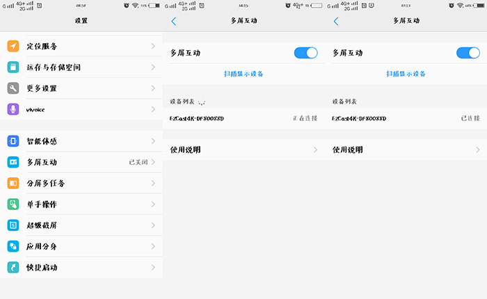 第二步,找到手機(jī)無(wú)線顯示/多屏互動(dòng)/屏幕共享/媒體輸出/屏幕投射開關(guān),搜索EZCast4K設(shè)備,連接成功即可同屏。