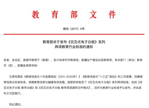 為整頓行業的市場“渾濁”現象,前不久,國家教育部發布了教技【2017】6號文件《交互式電子白板》系列兩項教育行業標準,包括《交互式電子白板?教學功能》和《交互式電子白板?教學資源通用文件格式》,旨在更好規范交互式電子白板和大屏一體機的教學功能,保障教育信息化健康有序發展。