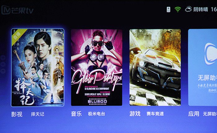 開機體驗 整個GMUI系統的UI界面,主要分為了影視、音樂、游戲及應用幾類,配合Metro磁貼風格的圖標,非常的直觀且方便點選,同時無論是影視資源、亦或者音樂及游戲資源的內容豐富度都很令人點贊。