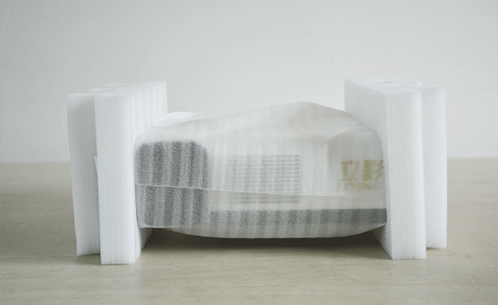 拿出產品,只見產品嵌在厚實的海綿上,機身也有泡沫袋保護,不必擔心機器在包裝箱內比磕損,透過白色的泡沫袋,依稀看到立影白色機身,與保護色“渾然一體”。