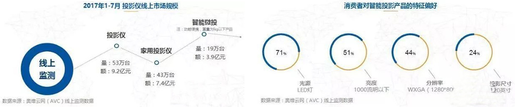 據(jù)相關數(shù)據(jù)顯示,2017年1-7月,投影儀線上零售市場銷量53萬臺,銷額9.2億元。其中家用市場投影儀零售量43萬臺,銷額7.4億元;智能微投產(chǎn)品銷量19萬臺,銷額3.9億元。從數(shù)據(jù)中顯示,家用領域無疑成為投影細分市場的“大贏家”,而智能投影也占據(jù)家用領域?qū)⒔话氲氖袌龇蓊~,這樣的成績,讓整個智能投影市場注入了“鮮活的血液”,讓人對2018年智能投影市場充滿期待。
